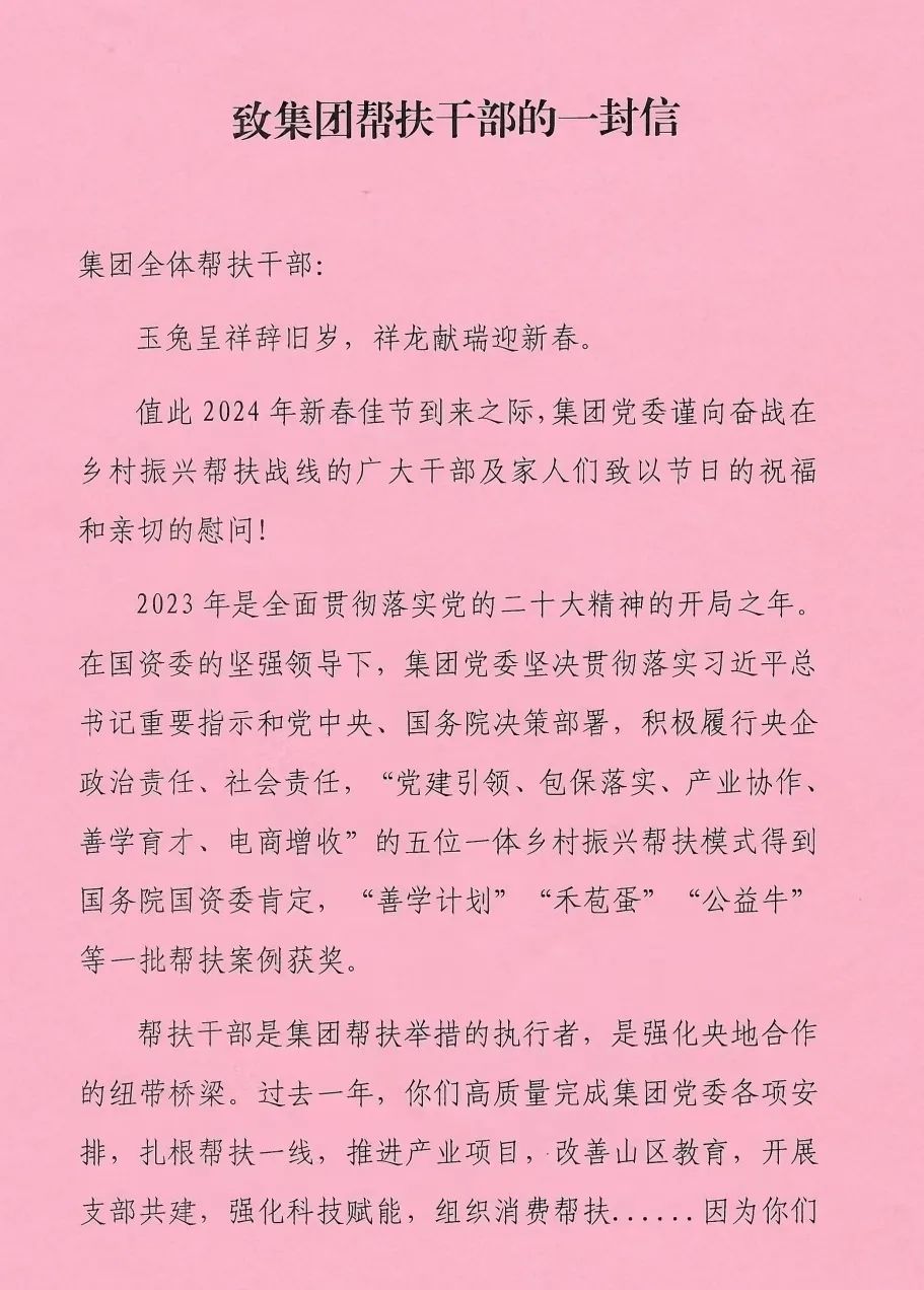值此2024年新春佳節(jié)到來(lái)之際,集團(tuán)黨委謹(jǐn)向奮戰(zhàn)在鄉(xiāng)村振興幫扶戰(zhàn)線的廣大干部及家人們致以節(jié)日的祝福和親切的慰問(wèn)!