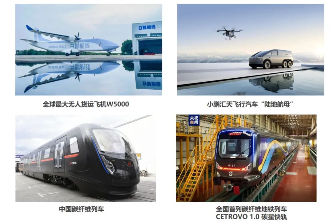在交通領(lǐng)域,碳纖維正在重構(gòu)“出行效率”的天花板。商用航空方面,中復(fù)神鷹的SYT59G-12K碳纖維通過(guò)中國(guó)商飛預(yù)批準(zhǔn),自研的T800級(jí)預(yù)浸料Y603成為國(guó)產(chǎn)大飛機(jī)備份供應(yīng)商,能幫助飛行器減重15%,大幅提升燃油效率;低空經(jīng)濟(jì)領(lǐng)域,中復(fù)神鷹的SYM40等產(chǎn)品助力全球最大無(wú)人貨運(yùn)機(jī)W5000起飛——這款飛機(jī)85%的重量來(lái)自碳纖維,總重僅2.1噸,載重與航程雙雙突破;軌道交通中,全國(guó)首列碳纖維地鐵列車(chē)使用中復(fù)神鷹的SYT49S-12K碳纖維,既減輕車(chē)身重量,又提升抗沖擊性;新能源汽車(chē)領(lǐng)域,小米SU7 Ultra的碳陶制動(dòng)盤(pán)、比亞迪仰望U9的車(chē)身部件,背后都是中復(fù)神鷹的碳纖維支撐。