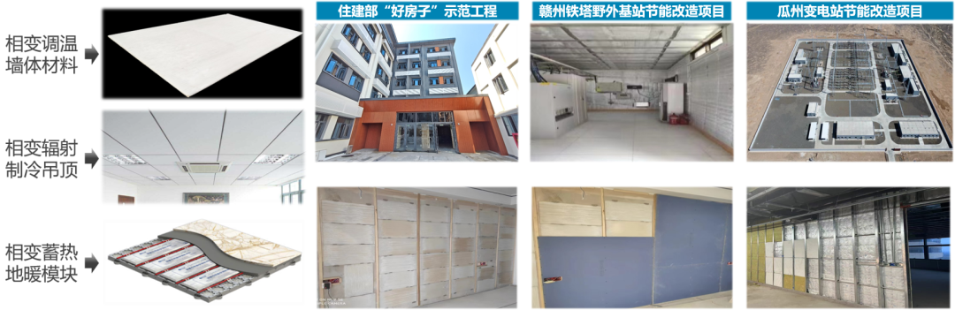 通過二次封裝技術,相變材料已實現(xiàn)建材化,產(chǎn)品形式包括:裝飾一體化相變調(diào)溫板材、相變輻射制冷吊頂系統(tǒng)、相變蓄熱地暖模塊等。應用案例包括住建部“好房子”示范工程CCB建融家園裝修改造項目、贛州鐵塔野外基站節(jié)能改造項目、瓜州變電站節(jié)能改造項目等。在河南某辦公樓地暖相變蓄能改造項目中,節(jié)能率達20%,通過峰谷電套利年省電費達55%。