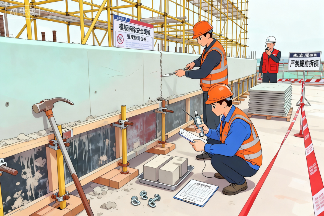 03、要嚴格把控拆模時機,側(cè)模拆除前,需確認混凝土已完全終凝并達到規(guī)定強度。底模拆除應嚴格依據(jù)同條件試塊強度及構(gòu)件跨度確定,嚴禁提前拆模。
