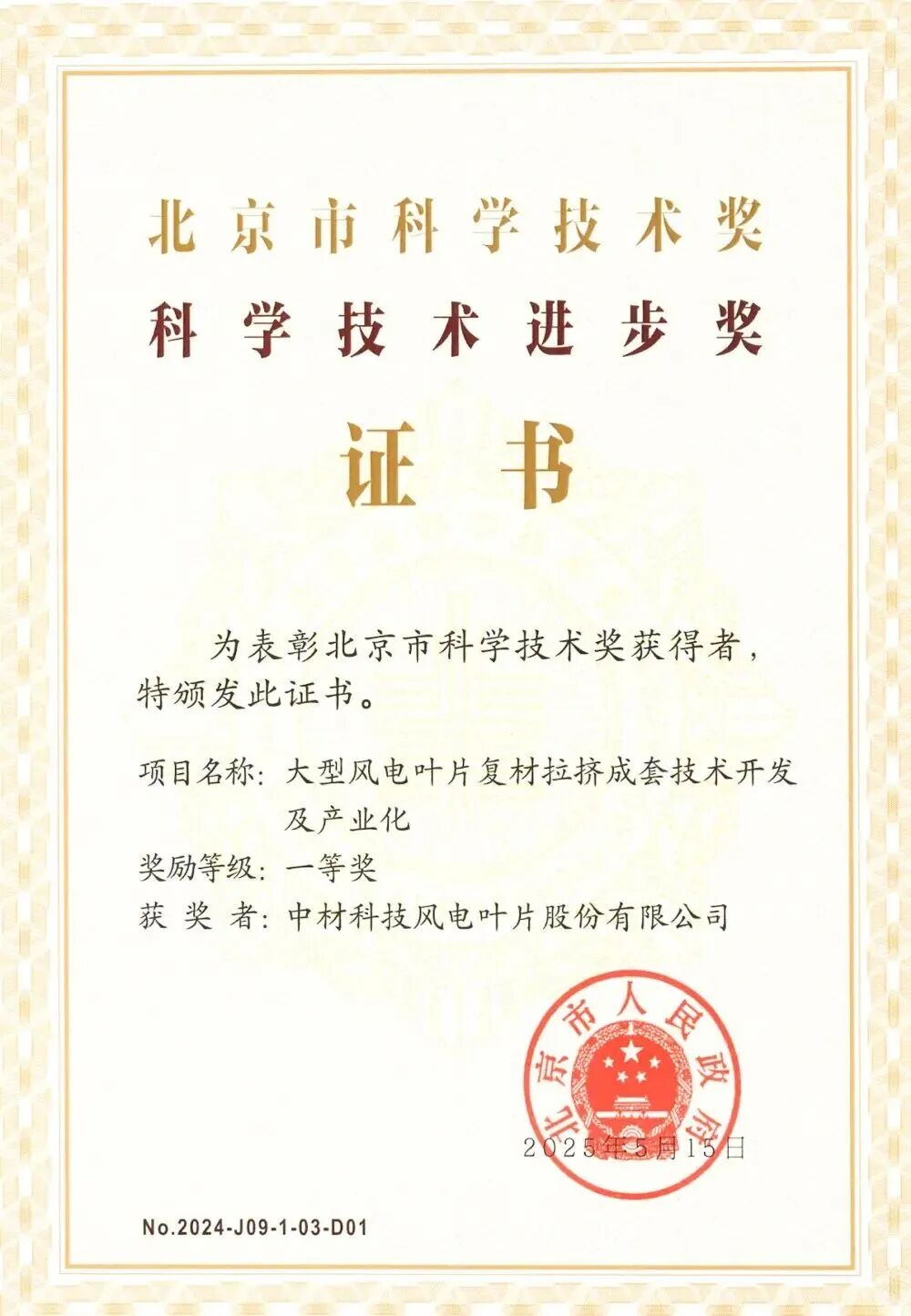 近日,2024年度北京市科學技術(shù)獎勵大會在京召開,由中材科技股份有限公司所屬中材科技風電葉片股份有限公司(簡稱“中材葉片”)牽頭,聯(lián)合北京玻鋼院復合材料有限公司、泰山玻璃纖維有限公司等多家單位共同完成的大型風電葉片復材拉擠成套技術(shù)開發(fā)及產(chǎn)業(yè)化項目,榮獲2024年度北京市科學技術(shù)獎科技進步獎一等獎。