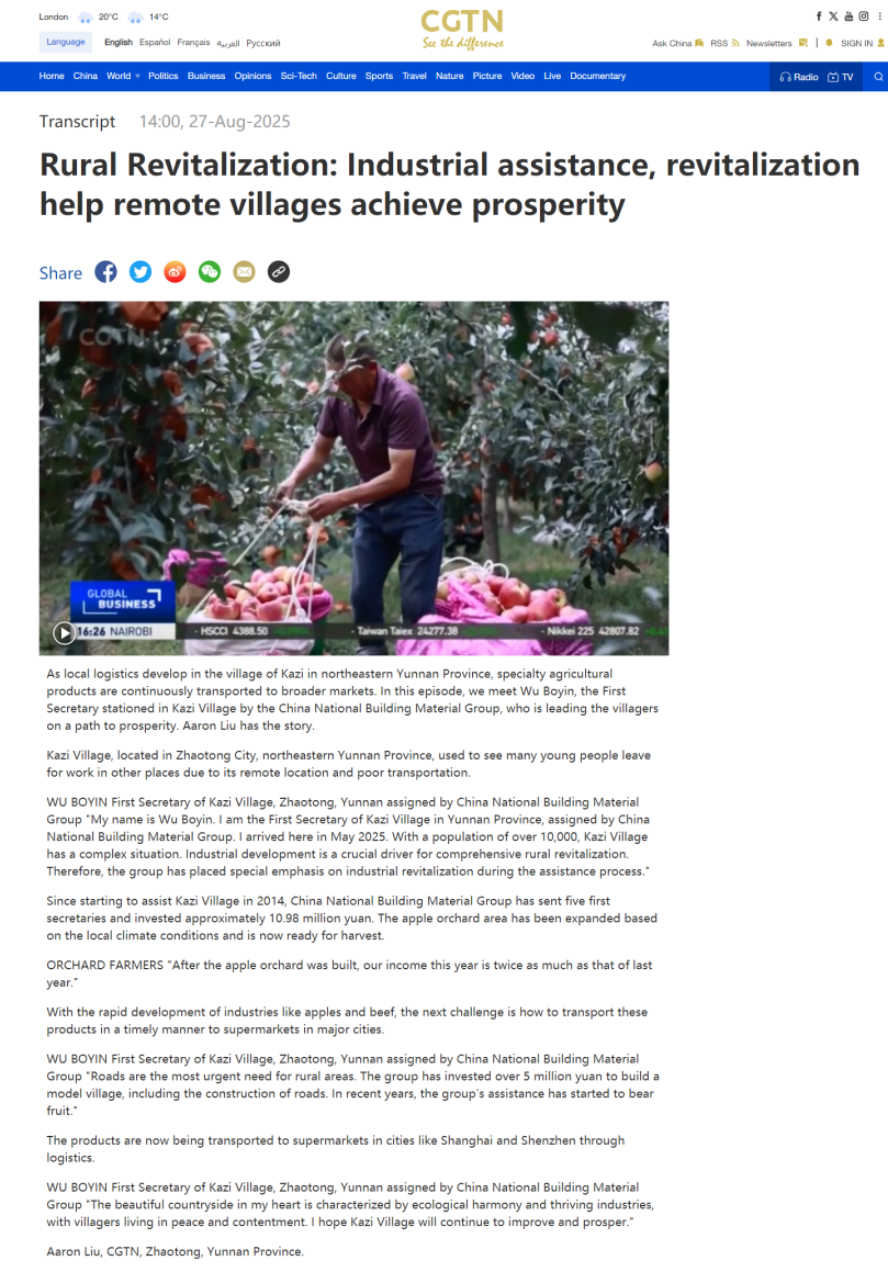 來源:CGTN 發(fā)布時間:2025-10-20超贊??!中國國際電視臺以《Rural Revitalization:Industrial assistance, revitalization help remote villages achieve prosperity》(譯《鄉(xiāng)村振興:產(chǎn)業(yè)幫扶助力偏遠(yuǎn)鄉(xiāng)村繁榮振興》)為題,全英文整版刊發(fā)報道,圖文并茂地向世界展現(xiàn)中國建材集團(tuán)云南昭通幫扶成果。下面,跟隨小料一起來看看吧~