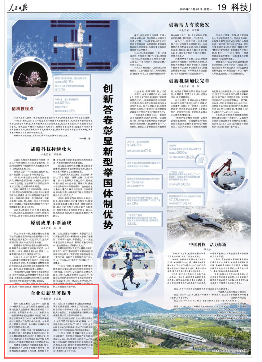 來源:人民日報(bào) 發(fā)布時間:2025-10-2310月20日,《人民日報(bào)》整版聚焦“十四五”期間的創(chuàng)新科技成果,彰顯我國新型舉國體制優(yōu)勢。其中,《企業(yè)創(chuàng)新顯著提升》一文報(bào)道中國建材集團(tuán)旗下中建材玻璃新材料研究院成功研發(fā)全球首片8.6代OLED超薄浮法玻璃基板,打破高世代玻璃基板長期被國外壟斷的局面,實(shí)現(xiàn)我國顯示玻璃技術(shù)從跟跑到領(lǐng)跑的跨越,展現(xiàn)企業(yè)創(chuàng)新主體地位和產(chǎn)學(xué)研融合體系的顯著提升。一起來看看全文報(bào)道吧!