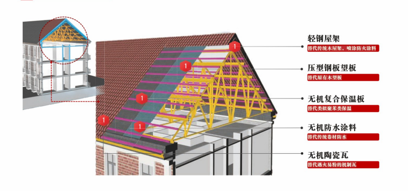 在近70年的老舊小區(qū)改造中,中國建材集團發(fā)揮產(chǎn)業(yè)鏈優(yōu)勢,統(tǒng)籌所屬北新建材、國檢集團等十余家專業(yè)企業(yè),形成覆蓋設(shè)計、材料、施工、檢測的全鏈條解決方案。針對大屋脊結(jié)構(gòu)消防隱患與功能缺陷,中國新材院、咸陽陶瓷院設(shè)計輕鋼屋架體系,提升耐久性與抗震性能;北新燈塔更新產(chǎn)品設(shè)計,將防火涂料從耐火極限的2.5小時,提高到4.5小時,全面提高輕鋼屋架體系的耐火極限;中巖科技、山東工陶院提供A級無機保溫材料,實現(xiàn)防火保溫雙升級;江西中材研發(fā)發(fā)泡陶瓷防火隔離帶,構(gòu)建多層防護體系;北新防水、水泥新材院分別通過耐熱防水卷材、無機復(fù)合防水材料,實現(xiàn)防水防火的雙升級;國檢集團與中存大數(shù)據(jù),打造智慧監(jiān)測系統(tǒng),提升居住安全性;咸陽陶瓷院推出高吸水率A級防火陶瓷瓦,兼顧實用與美觀。該綜合解決方案推動木質(zhì)大屋脊向“不燃、耐久、綠色、節(jié)能”現(xiàn)代屋頂系統(tǒng)轉(zhuǎn)型,相關(guān)技術(shù)已在2025年11月北京鳥巢消防技術(shù)交流展中亮相,為全國同類項目提供可推廣應(yīng)用路徑。